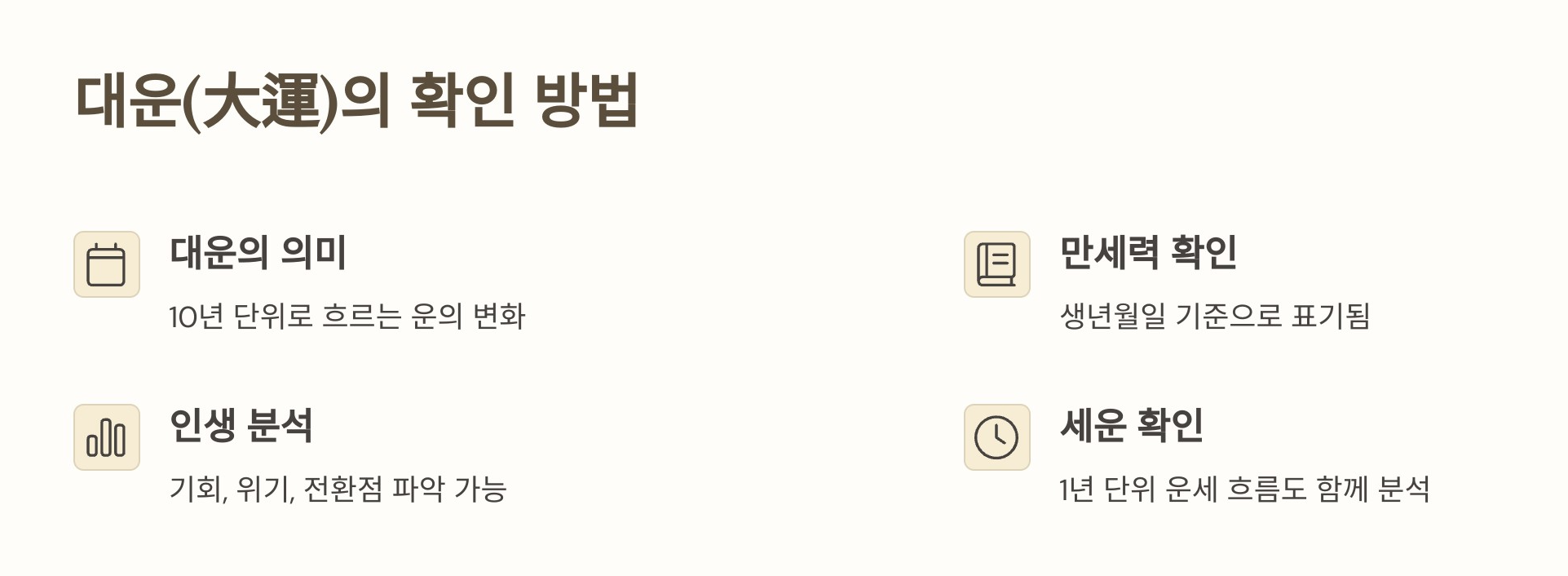 - 출생 시간은 부모님께 꼭 확인 : 2시간 단위로 시주가 달라지므로 애매한 경우에는 사주의 전반적 해석이 달라질 수 있습니다.